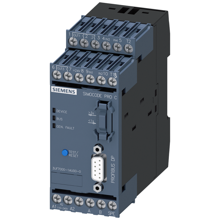 Basic unit SIMOCODE pro C, PROFIBUS DP interface 12 Mbit/s, RS 485, 4I/3O freely parameterizable, Us: 110...240 V AC/DC, input for thermistor connection Monostable relay outputs
