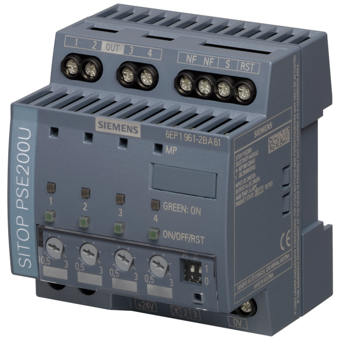SITOP PSE200U 3 A NEC Class 2 Selectivity module 4-channel input: 24 V DC/12 A output: 24 V/4x 3 A NEC class 2 threshold value adjustable 0.5-3 A with status message for each output *Ex approval no longer available*