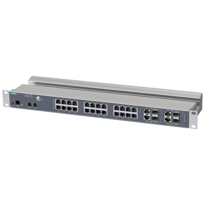 SCALANCE XR328-4C WG; managed IE switch; 19" rack; 24 x 10/100 Mbit/s electrical ports; 4 x 1000 Mbit/s combo ports electrical or optical; LED diagnostics; Reset button; console port; PROFINET Device; network management Function; redundancy manager; no UL/FM approval; Power supply 24 V DC;