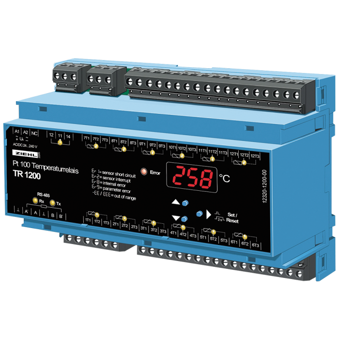 RTD-BOX TR1200 DISTRIBUTED INPUT-BOX FOR 12 RTD-CONNECTIONS PT100 (THERMOBOX) RAIL MOUNTING PLASTIC, PROTECTION CLASS IP21 1 SERIAL INTERFACE RS485 FOR COMMUNICATION OF MEASUREMENTS WIDE RANGE POWER SUPPLY AC/DC 24-240V NOTE: THE DEVICE CAN BE OPERATED IN A 7XV5662-2AD10 OR 7XV5662-5AD10 OF COMPATIBLE MODE.