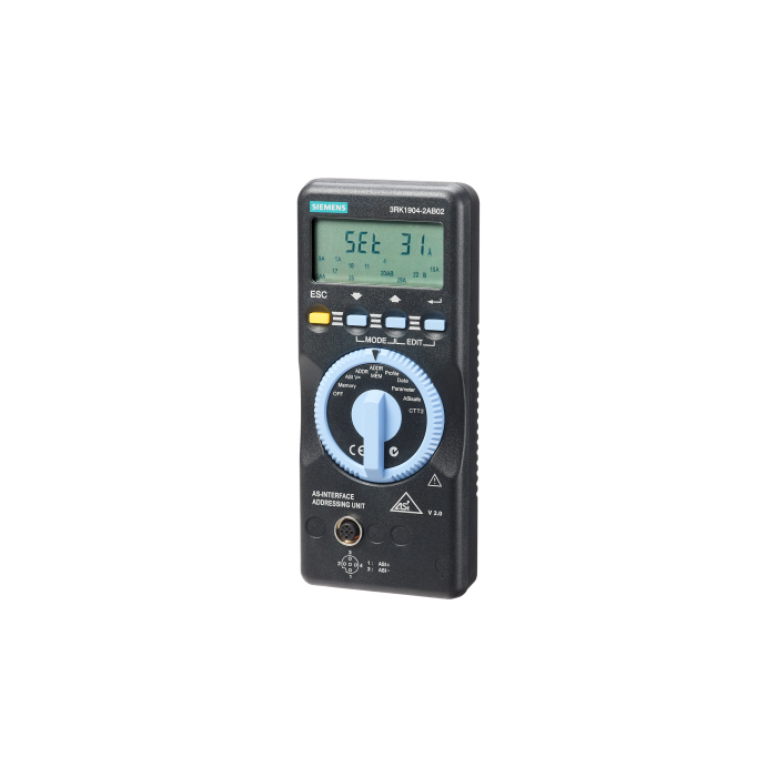 AS-Interface Addressing unit V3.0 for setting the addresses of AS-i slave modules Input/output test and further functions AS-i specification V3.0 M12 connection socket with addressing cable 1.5 m (M12 connector/hollow plug) with batteries (4 x 1.5 V LR6)